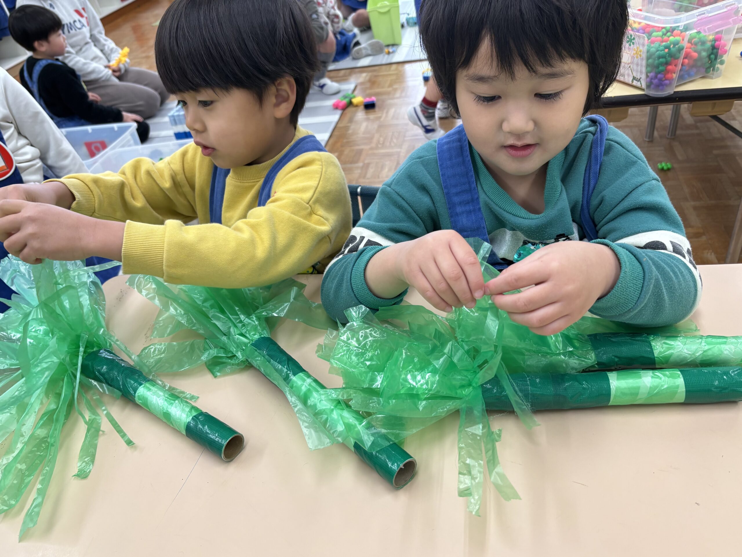 ハチさんはお花が咲いている草を大きな段ボールで変身させたり、ありさんはお荷物を運ぶ食べ物を作ったり、バッタさんはかくれんぼをする草を考えて作ったりすることも楽しみました🌸