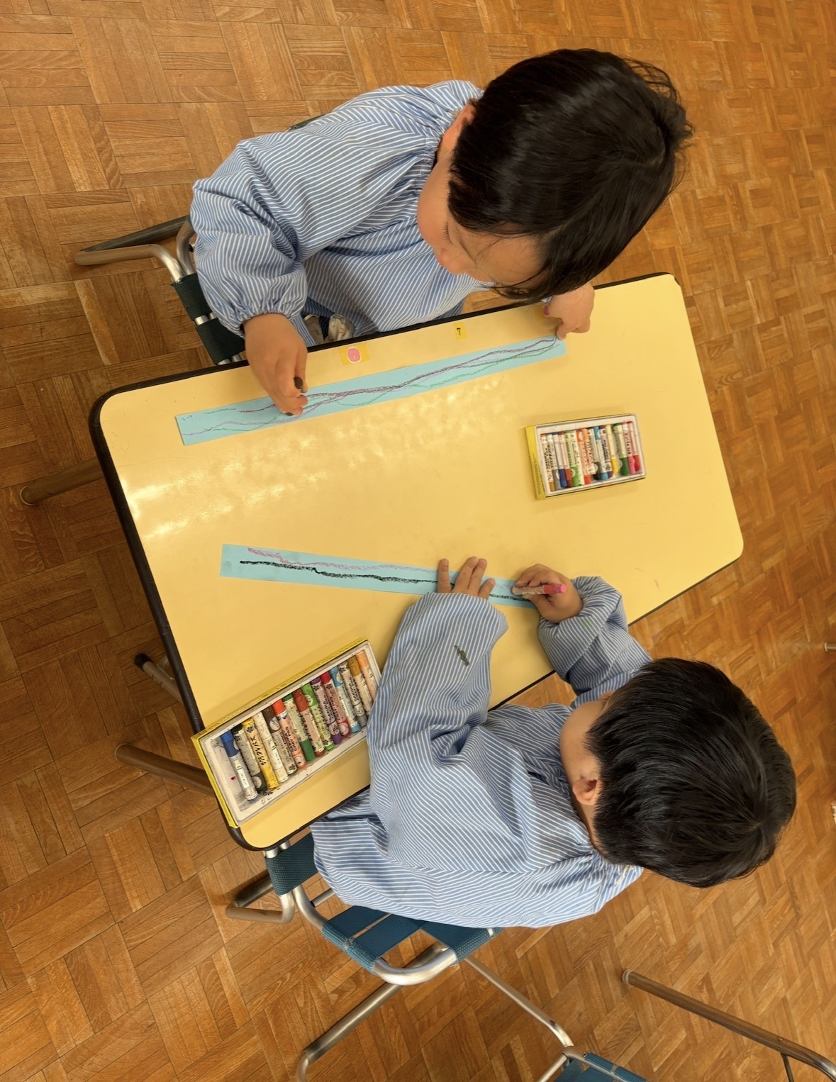 駅員さんの帽子を作ったり、後ろに飾る背景を塗ったり、イメージを膨らませながら、電車や駅のホームをクレパスで想像画しました🚅⭐「電車には誰をのせようかな」と会話を弾ませながら楽しんでいましたよ☺
