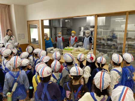 実際に調理をしている場所を見せていただき、子どもたちも日頃どのようにして給食が作られているのか見ることができました🍴