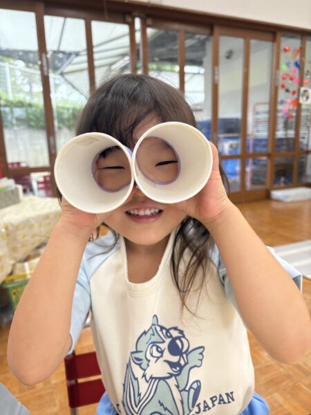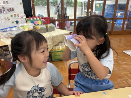 また、お宝を見つける為に双眼鏡作りをしました。子どもたちは、「どんな、宝物が見つかるかな?」とワクワクした気持ちで作り、友だちとお顔をのぞきあって笑顔も見つけていました♪
