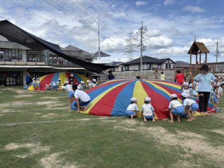 パラバルーンにでは、子どもたちを笑顔いっぱいで大きく膨らませ、楽しんでいる子どもたちです。