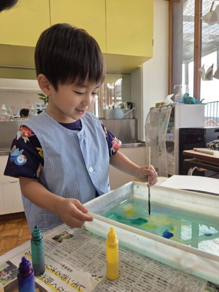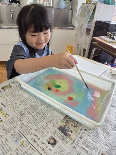 万国旗づくりでは、赤色、青色、黄色、緑色、オレンジの中から好きな色を選び、マーブリングに挑戦です!色がきれいに混ざっていき、素敵な模様ができていく様子を見ているのを見て「わー、きれい!」と大興奮でした✨