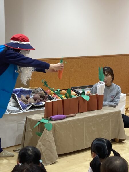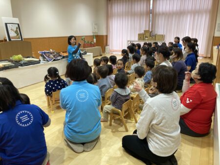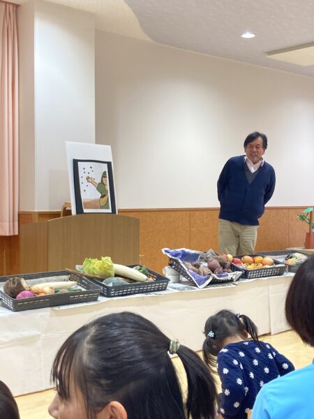 保育園では保護者の方にご協力いただき、ほし組・そら組はくだもの、にじ組はお野菜を持ち寄って収穫感謝祭を行ないました。